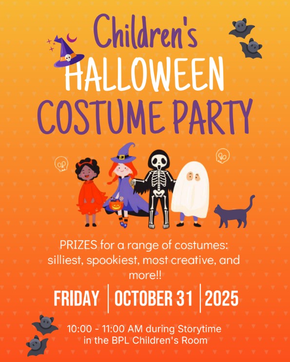 No registration is required—just drop in, dress up, and get ready for a magical morning of Halloween fun. We can’t wait to see all the costumes and share in the excitement at the Bridgton Public Library’s Halloween Costume Party and Story Time!