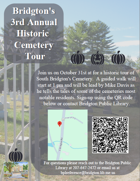 Join us on Friday, October 31 at 1:00 PM for a guided tour through one of Bridgton’s oldest and most storied burial grounds, the South Bridgton Cemetery (Adams Pond Yard). Together, we’ll uncover the fascinating lives and legacies of the people who helped shape South Bridgton’s early community.